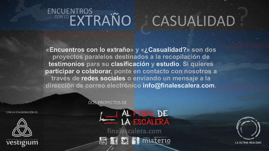 En la actualidad disponemos de los medios necesarios para llevar a cabo una clasificación ordenada y pormenorizada de este tipo de experiencias. ¿Con qué objetivo? Con el de acumular la mayor cantidad de información posible y, de ese modo, disponer de material válido que pueda ser convenientemente analizado. Se trata de un trabajo necesitado, sin duda, de método y paciencia; pero ineludible si queremos avanzar en la compresión de este enigma. Ahí es donde nacen Encuentros con lo extraño y ¿Casualidad?, dos proyectos que comparten el propósito de recopilar el mayor número de experiencias posible para su posterior clasificación y estudio.