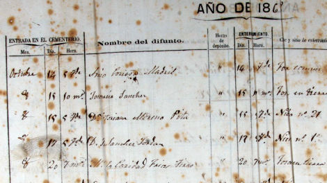 Como podemos apreciar en la fotografía, ésta no deja lugar a dudas respecto a cómo se llamaba la guardiana del cementerio. Hemos buscado en el libro de registro de enterramientos y sólo tenemos datos desde el 14 de octubre, por lo que no podemos conocer, al menos por el momento, la causa por la que se habla de Francisca Carillo y el 9 de octubre, cuando en realidad fue Juana Carillo el 1 de octubre de 1868.